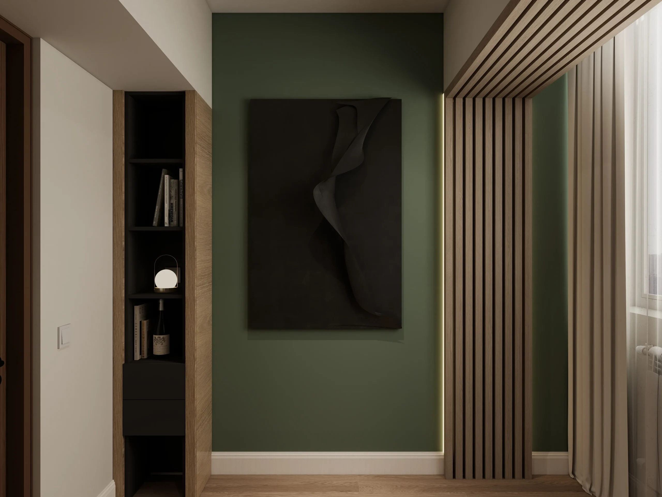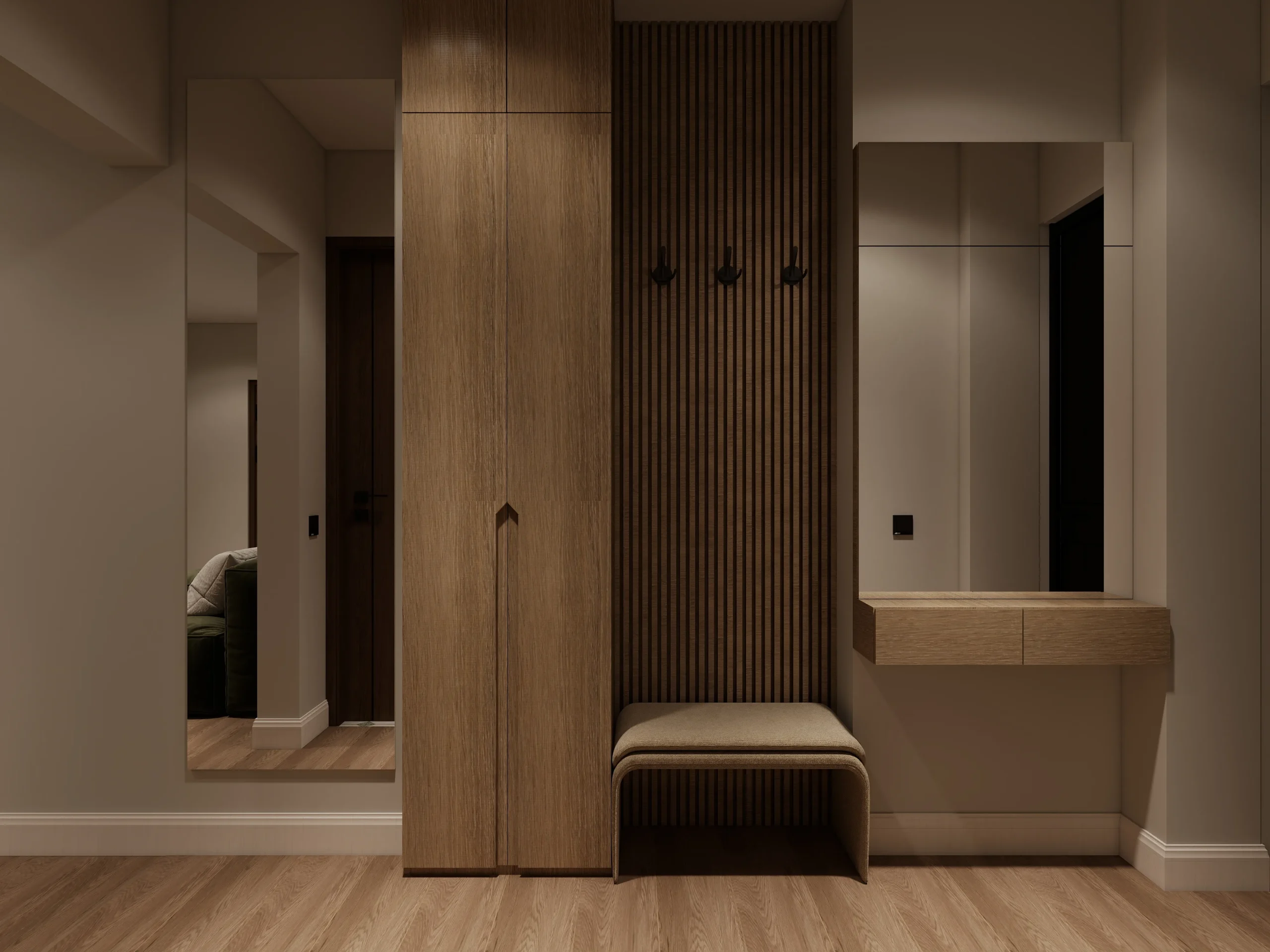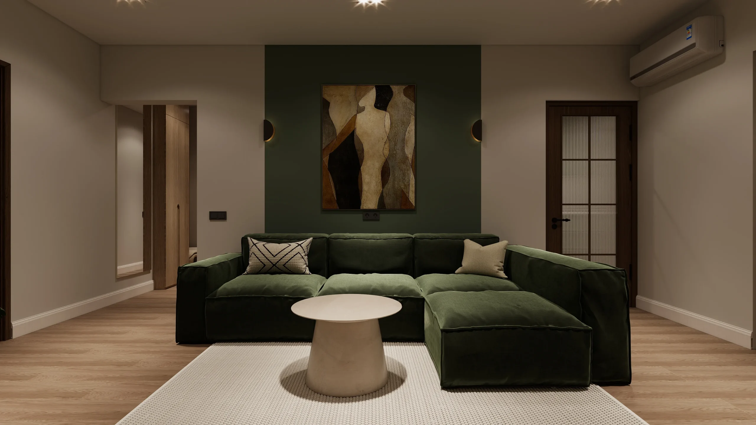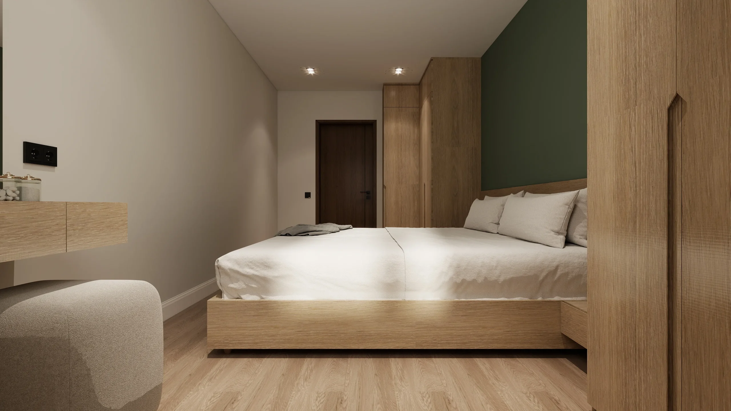 ინტერიერი შესრულებულია თანამედროვე ნატურალისტურ სტილში, სადაც დომინირებს თბილი ხის ფაქტურები და რბილი, მიწისფერი ტონები. სივრცე მშვიდი და ჰარმონიულია, აქცენტი გაკეთებულია ბუნებრივ მასალებსა და კომფორტულ ფორმებზე. დიზაინი აერთიანებს სიმყუდროვესა და თანამედროვე ესთეტიკას, რაც ქმნის მყუდრო, მაგრამ დახვეწილ საცხოვრებელ გარემოს.