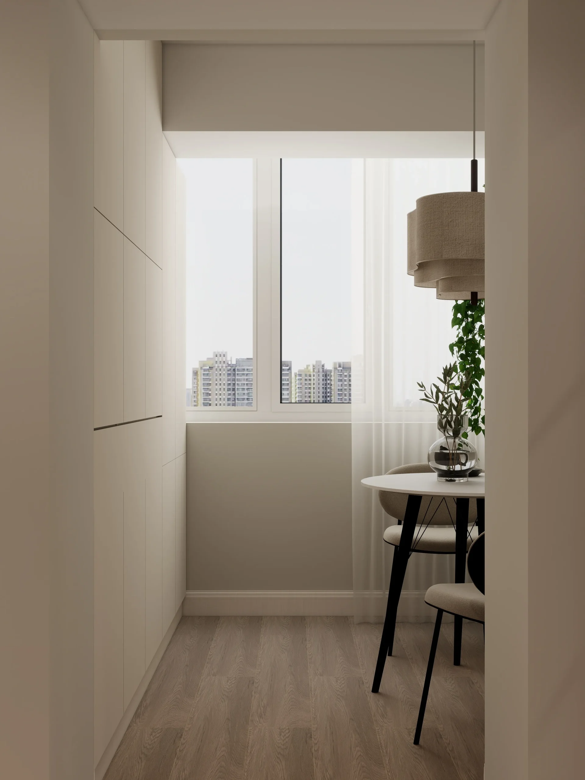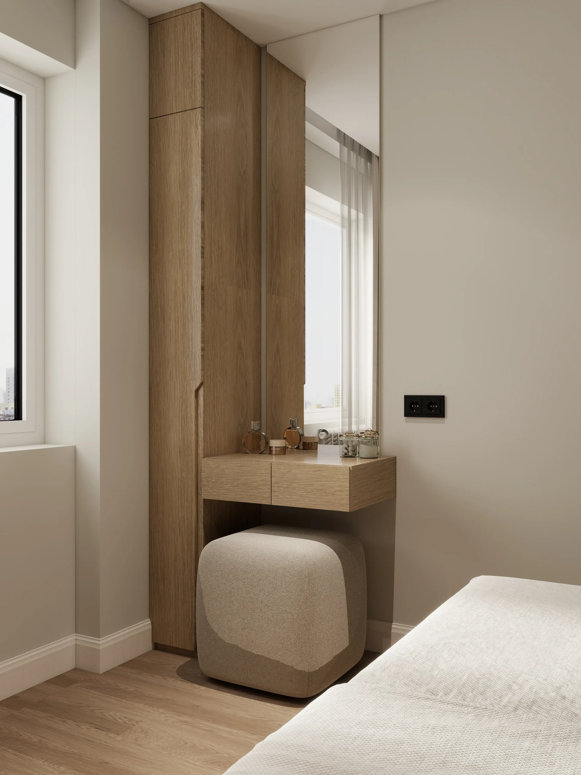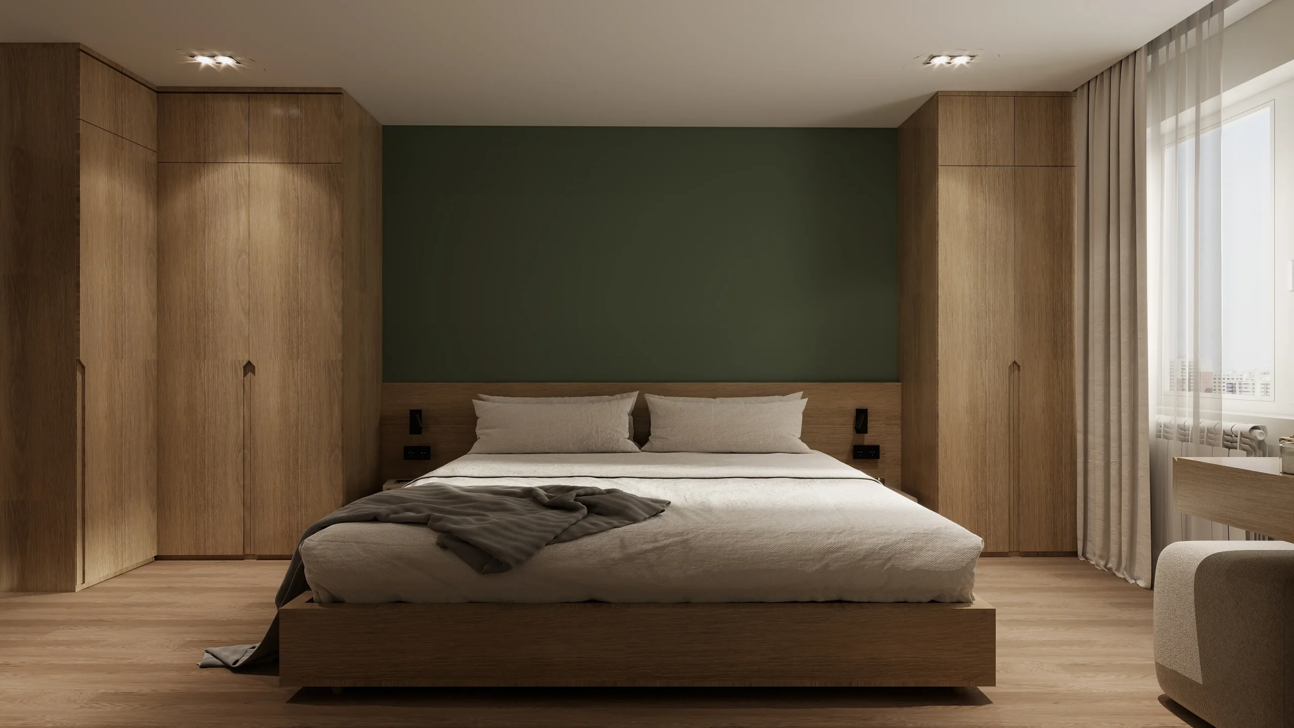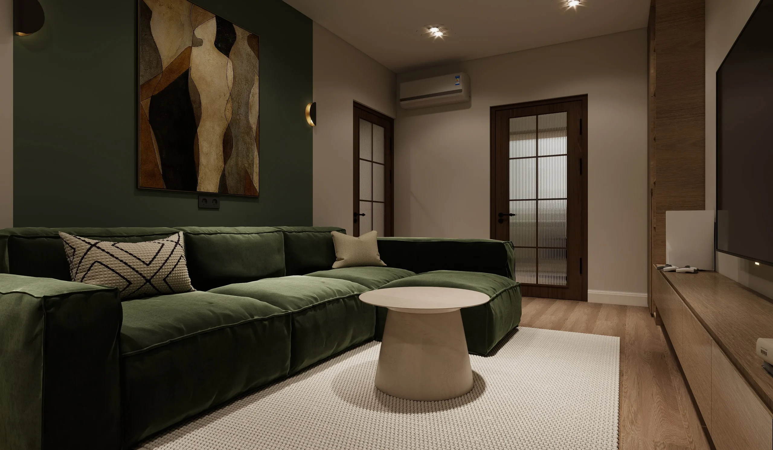 ინტერიერი შესრულებულია თანამედროვე ნატურალისტურ სტილში, სადაც დომინირებს თბილი ხის ფაქტურები და რბილი, მიწისფერი ტონები. სივრცე მშვიდი და ჰარმონიულია, აქცენტი გაკეთებულია ბუნებრივ მასალებსა და კომფორტულ ფორმებზე. დიზაინი აერთიანებს სიმყუდროვესა და თანამედროვე ესთეტიკას, რაც ქმნის მყუდრო, მაგრამ დახვეწილ საცხოვრებელ გარემოს.